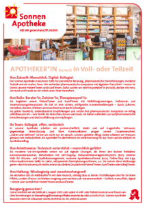 Wir suchen zum 1. August 2025 oder später eine*n engagierte*n Apothekerin (m/w/d) in Voll- oder Teilzeit. Persönliche Beratung, moderne Technik und pharmazeutische Dienstleistungen bis hin zum Impfen stehen bei uns im Mittelpunkt. Als Teil unseres kollegialen Teams übernehmen Sie Verantwortung für eine sichere und wirksame Arzneimitteltherapie und den Apothekenalltag. Digitale Tools wie Kommissionierautomat, digitales Dokumentenmanagement (ELO) und die moderne Apothekensoftware Ixos unterstützen Ihre Arbeit – aber nichts ersetzt das Gespräch mit Patient*innen und Kund*innen.